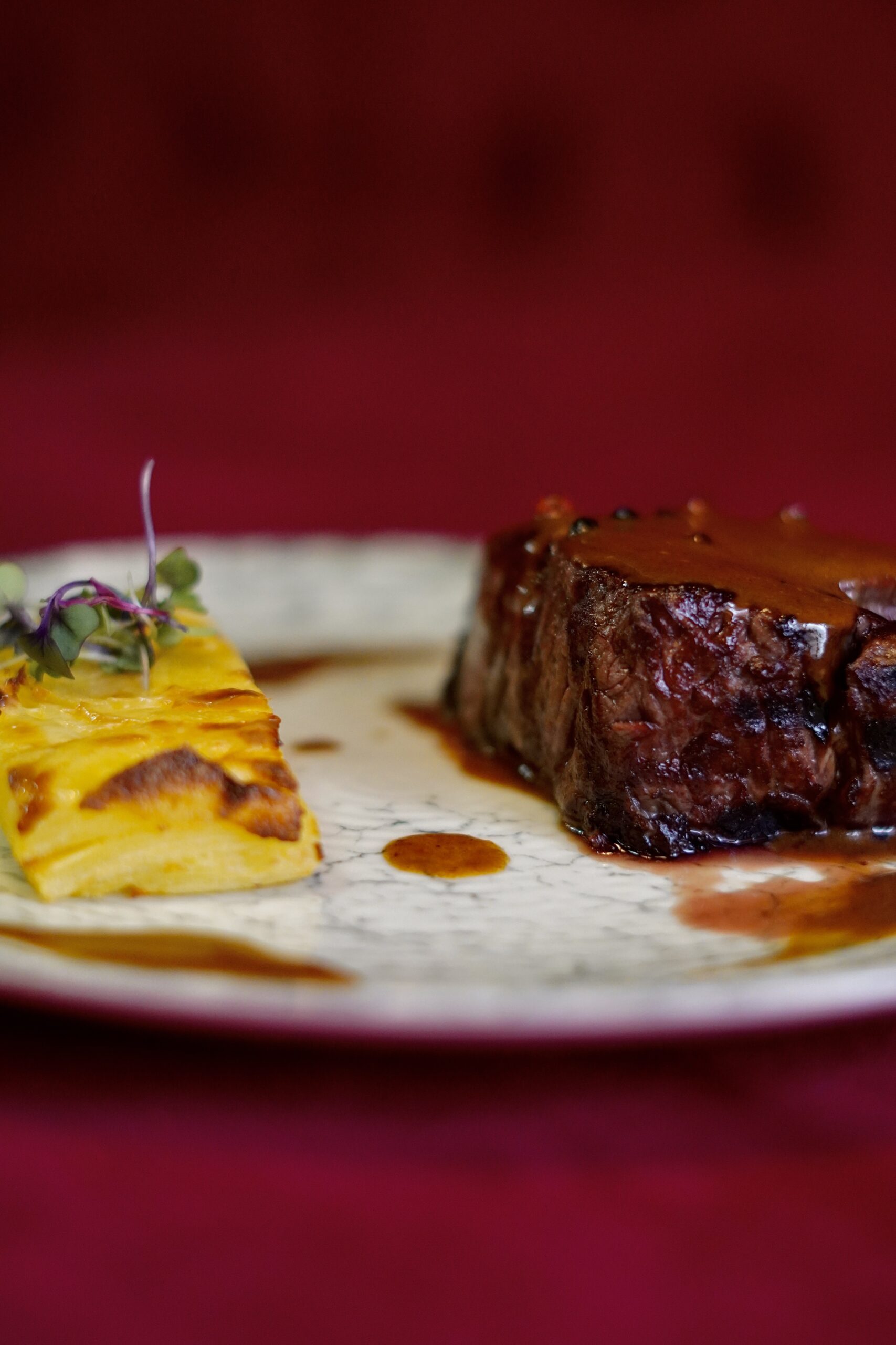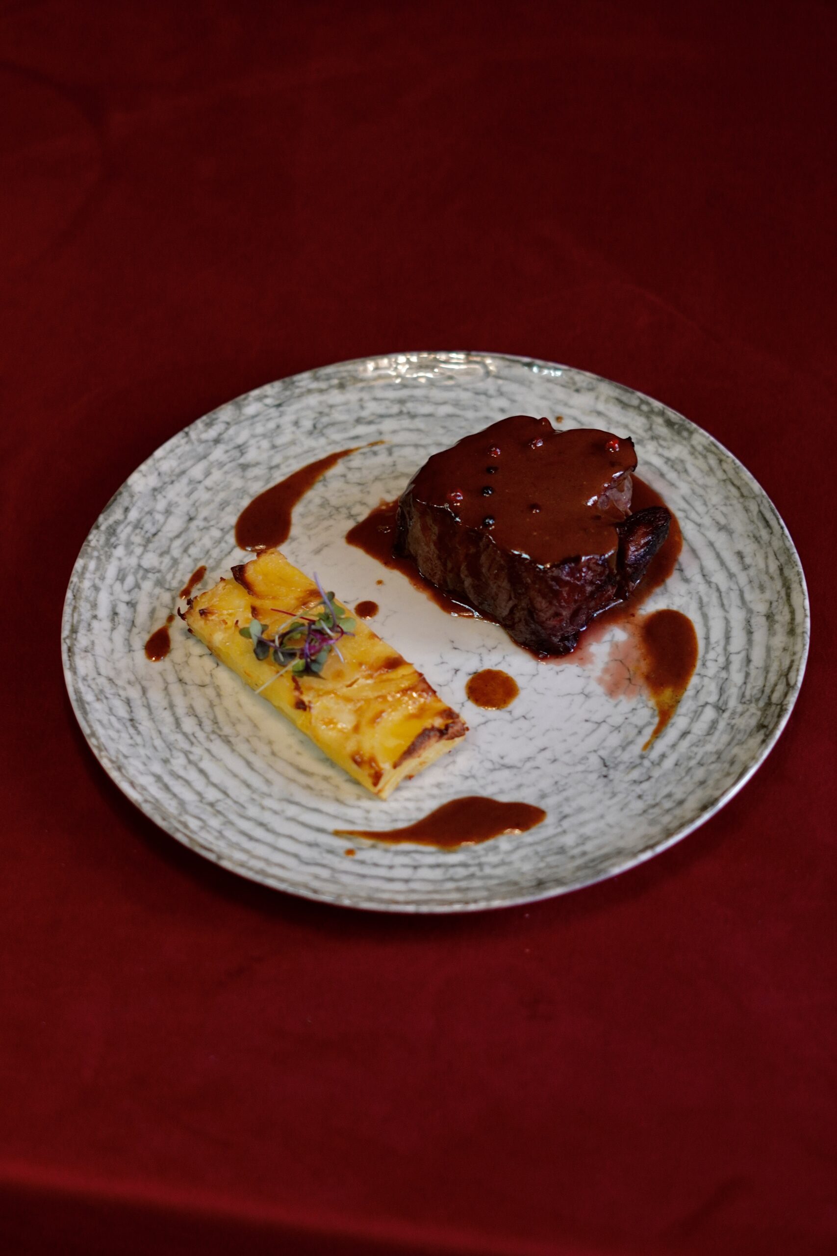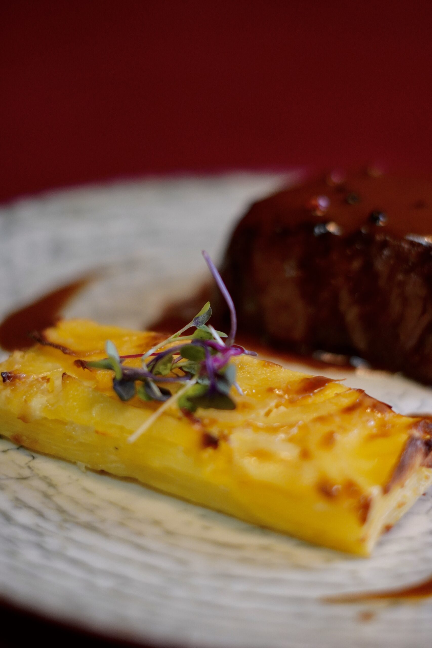 35€Con salsa de yogurt y menta, remolacha asada y soufflé de piel de salmón.